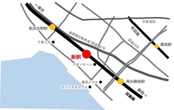 - >新習志野駅から約1.7km、海浜幕張駅から約1.7km