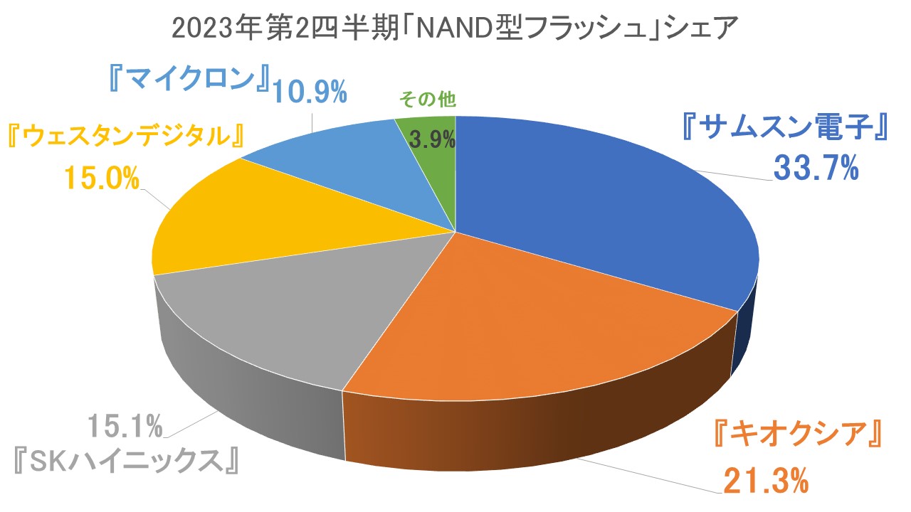 2023年第2四半期時点での、NAND型フラッシュメモリーの世界シェアは以下のようになっています。『キオクシア』が21.3%、『ウエスタンデジタル』が15.0%のシェアを持っていますので、