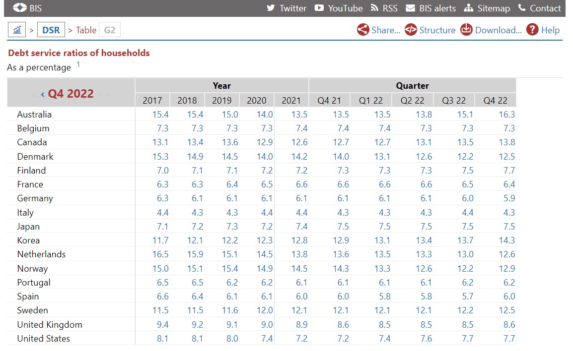 直近のデータでも、DSRが高い順に並べると以下のようになります。家計部門のDSR(2022年第4四半期時点)