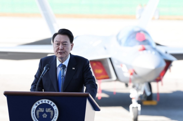 ↑開幕式を終えた後、KF-21について視察、質問をする尹錫悦(ユン・ソギョル)大統領(吉田ハンチング@dcp)