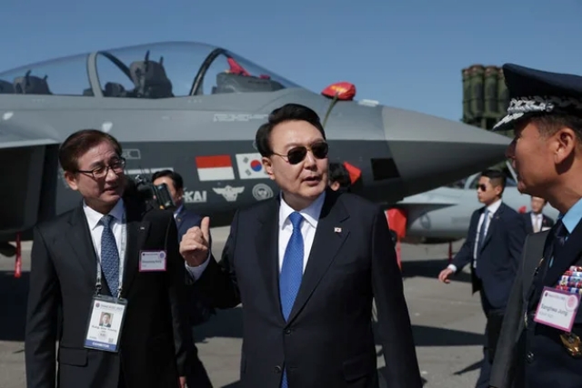 ↑開幕式を終えた後、KF-21について視察、質問をする尹錫悦(ユン・ソギョル)大統領(吉田ハンチング@dcp)