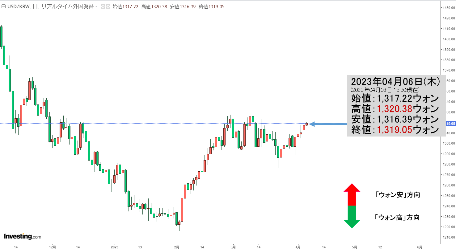以下は2023年04月06日、15:30時点でのドルウォンチャートです(チャートは『Investing.com』より引用:以下同)。