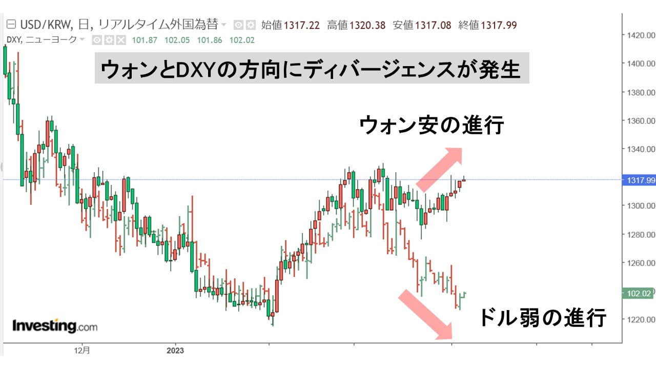 通常は、ドルウォンとDXYの進行方向は一致します。上掲のとおり、ドルが強くなればウォンが安くなり、ドルが弱くなればウォンは高くなります。