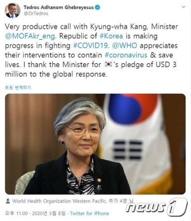 テドロス事務局長はこの日にツイッターを通じて「韓国の康京和(カン・ギョンファ)韓国外相ととても生産的な通話をした」として先のコメントを明らかにした。