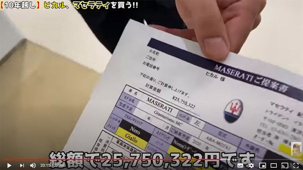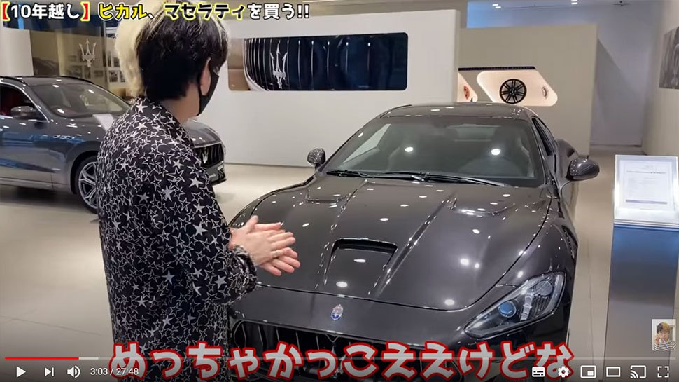 2020年8月6日、「ヒカル」(登録者数408万人)が「【10年越しの夢】ヒカル、新車でマセラティを買う」を公開。