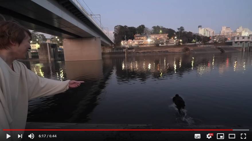 「一応水温確認してくるわ」と川に走っていくと、そのまま極寒の多摩川に飛び込みました。これにはトミーも「え?え?え?」と驚くばかり。