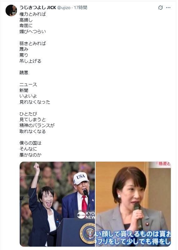 うじきは、高市氏がトランプ氏の横で拳をあげて笑顔を見せた写真や、格差・貧困問題に関する過去発言などを引用し「権力とみれば高揚し 卑屈に媚びへつらい 弱きとみれば蔑み 罵り吊し上げる 醜悪」と痛烈に批判。