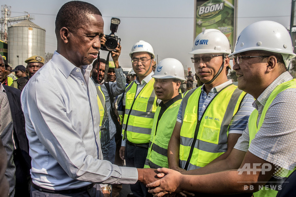 ザンビアの首都ルカサの幹線道路で、中国航空工業集団の中国人労働者と握手するザンビアのエドガー・ルング大統領