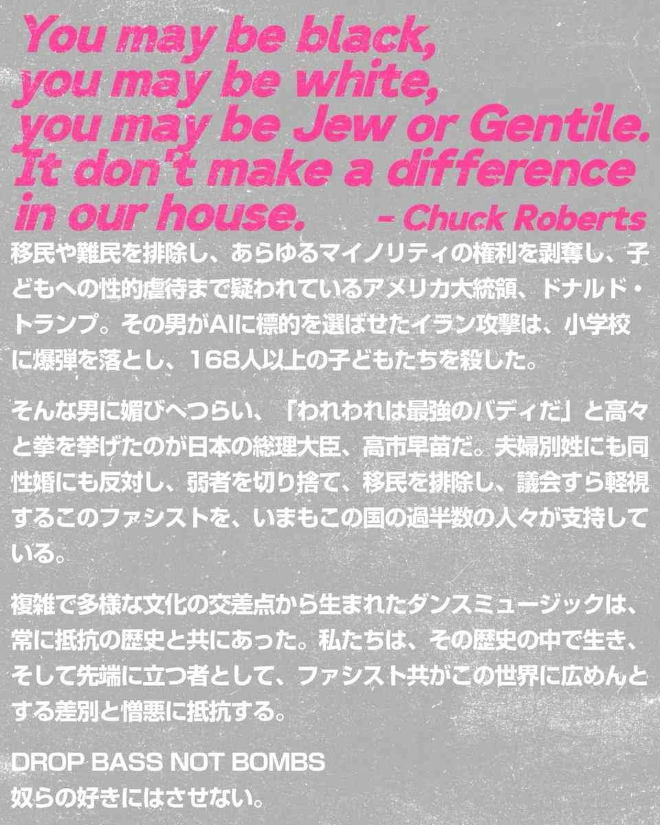 高市早苗首相、トランプ大統領に抗議するブロックパーティ「DROP BASS NOT BOMBS」が3月29日16:00から東京・新宿駅東南口広場で開催される。