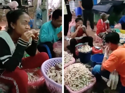 ウイルス伝線に繋がりかねないこの作業の一部始終。この映像は1月24日に撮影されたもので、映像の中身は労働者8人が生の鶏の足の骨を口を使い取り除いているのが確認出来る。