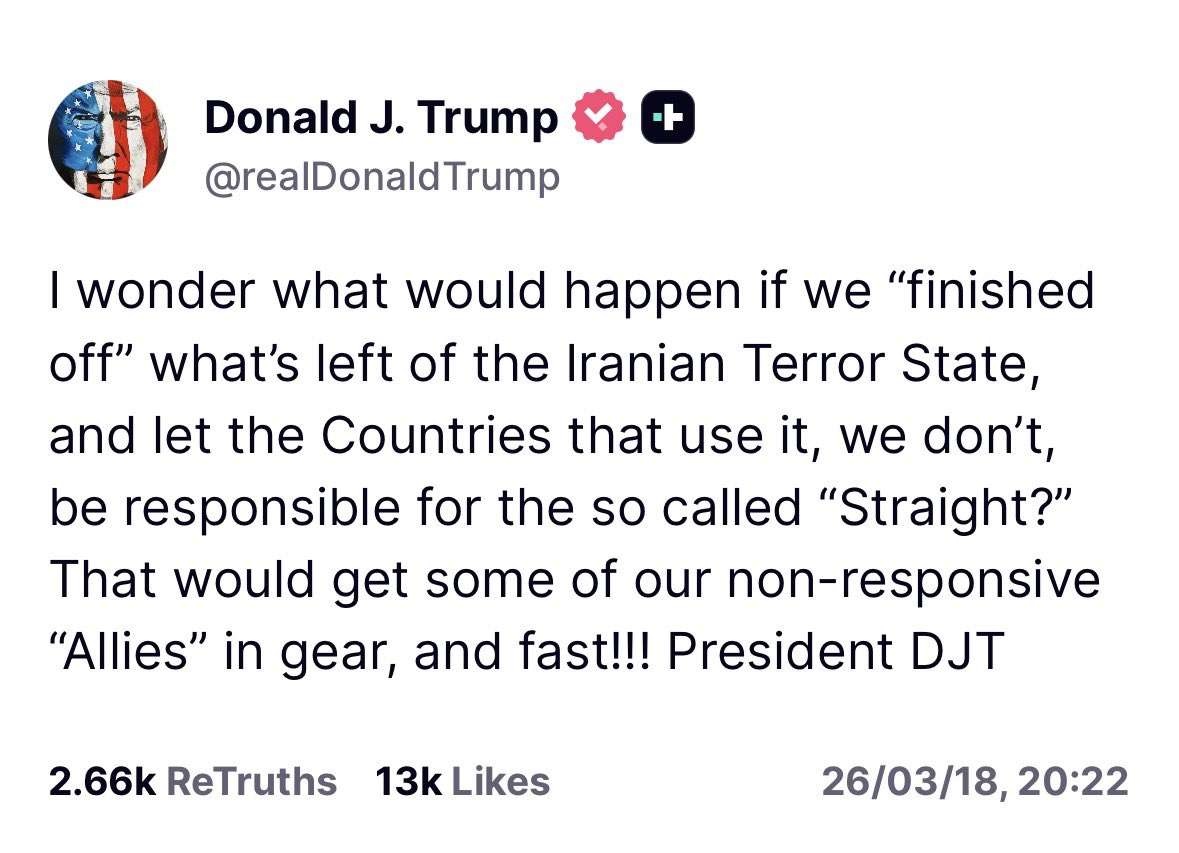 アメリカのいわゆる「イランのテロ国家」を完全に片付けてしまったらどうなるだろうか。そして、私たちは使っていないが他国は依存しているあの「海峡(ホルムズ海峡)」の責任を、その国々に任せたらどうなるか。そうすれば、これまで消極的だった我々の「同盟国」もすぐに動き出すだろう!!!