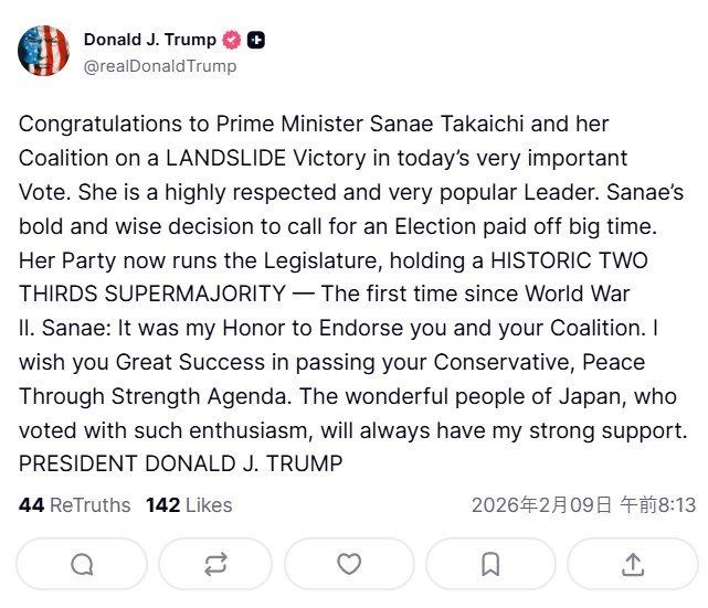 「サナエ氏が大胆かつ賢明に選挙を決断したことが大きな成果をもたらした」と評価した上で、「サナエ、あなたの連立政権を支持できたことは私の名誉だ。あなたの保守的な「力による平和」政策が成功することを心から願っている」などと投稿しました。