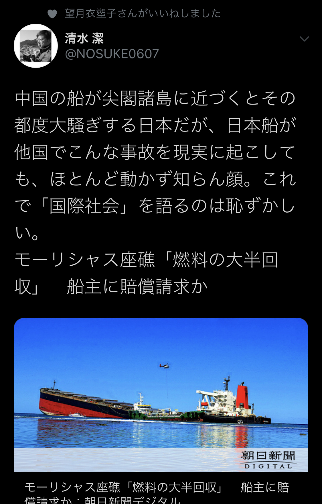 中国の船が尖閣諸島に近づくとその都度大騒ぎする日本だが、日本船が他国でこんな事故を現実に起こしても、ほとんど動かず知らん顔。これで「国際社会」を語るのは恥ずかしい。