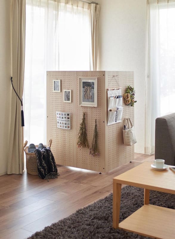 この仕切りにはフックなどを取り付けられる有孔ボードを採用し、簡易的な収納の設置や、インテイリアの飾りつけなどもできる。有孔ボードの穴は直径5mm、25mm間隔。色は、同社の内装ドアや床材とのコーディネートが可能な、落ち着いた木目調を採用。仕切り部には、明るいリビングに馴染む「ライトナチュラル柄」と、