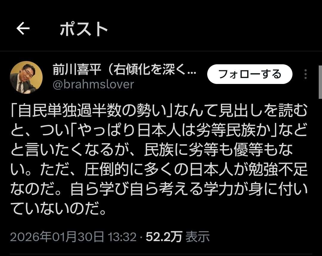 75 名前:押しボタン式の匿名希望者 投稿日時:2026/01/31(土) 23:59:33.05 ID:lwQJ0o9Z0