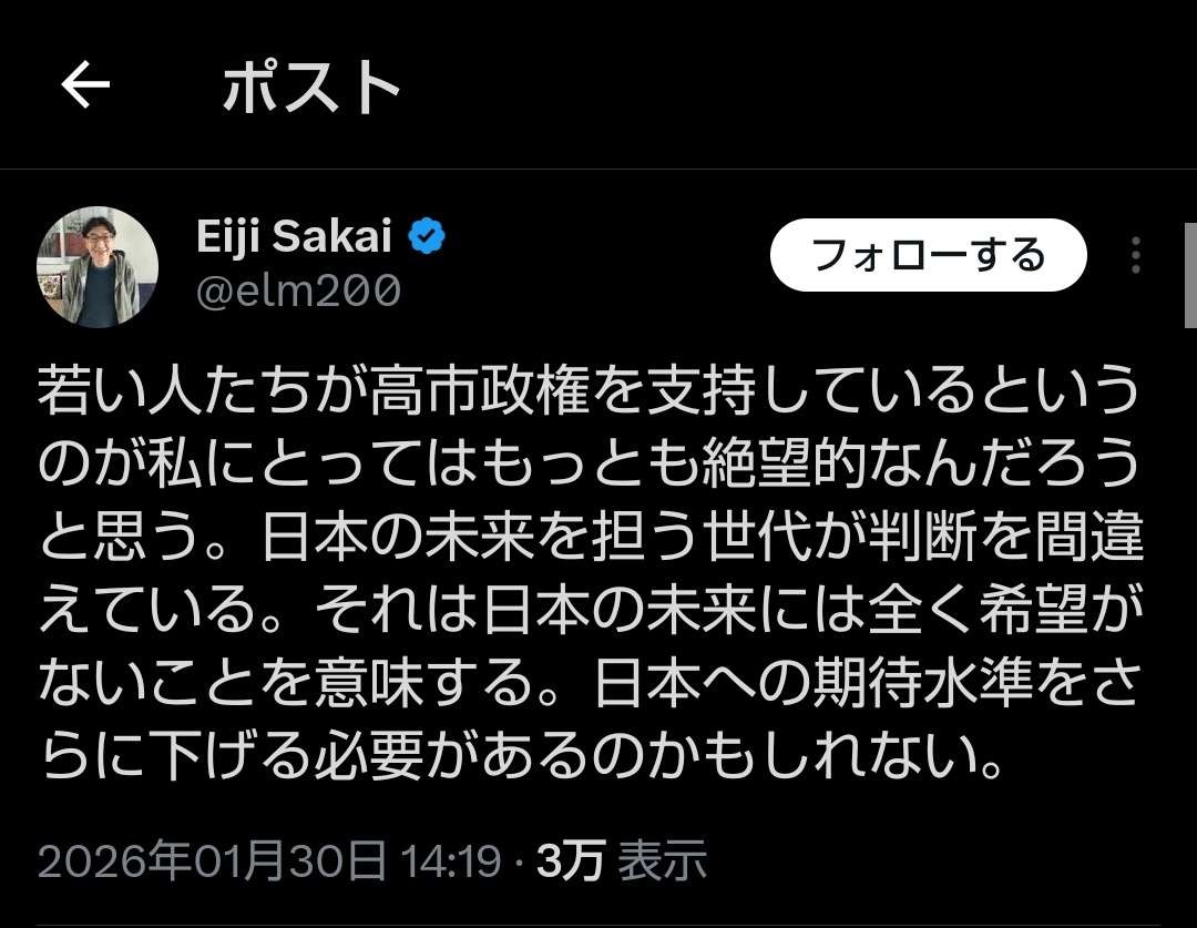 リベラル「自民単独過半数の勢い、日本人は劣等民族」「若い人達が高市支持、絶望的」