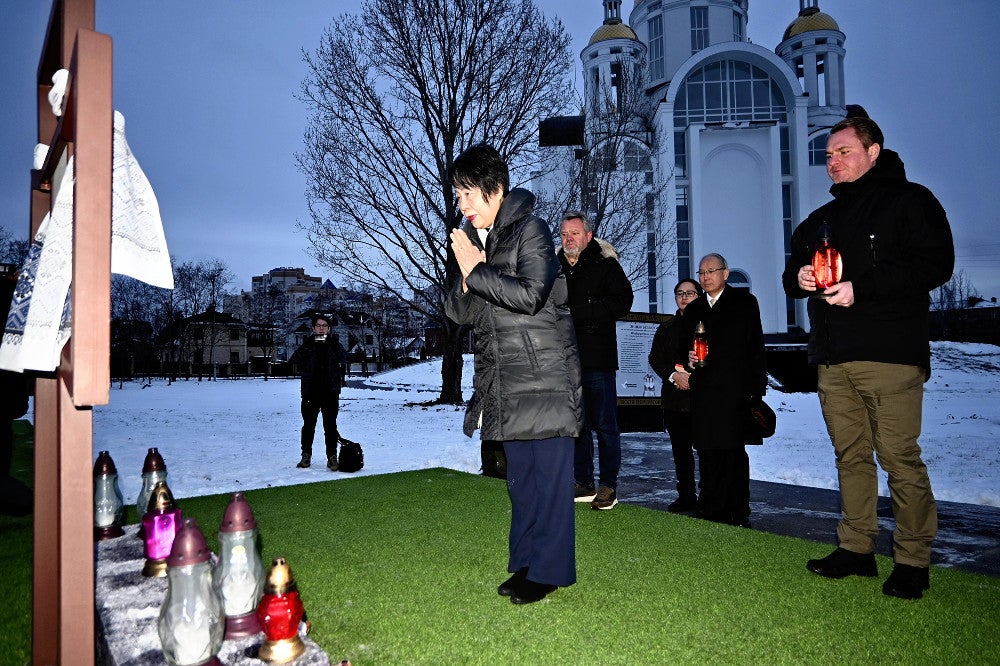 ブチャの教会敷地内の慰霊碑に祈りをささげる上川外相(7日午前、キーウ近郊ブチャで)