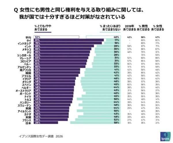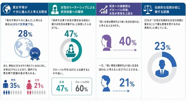 そして同じ国内でも男女で認識に差があります。日本では男性の35%が「進んでいる」と感じているのに対し、女性は21%にとどまっています。同じ社会の中にいても、見えている景色が少しずつ異なっている可能性もありそうです。