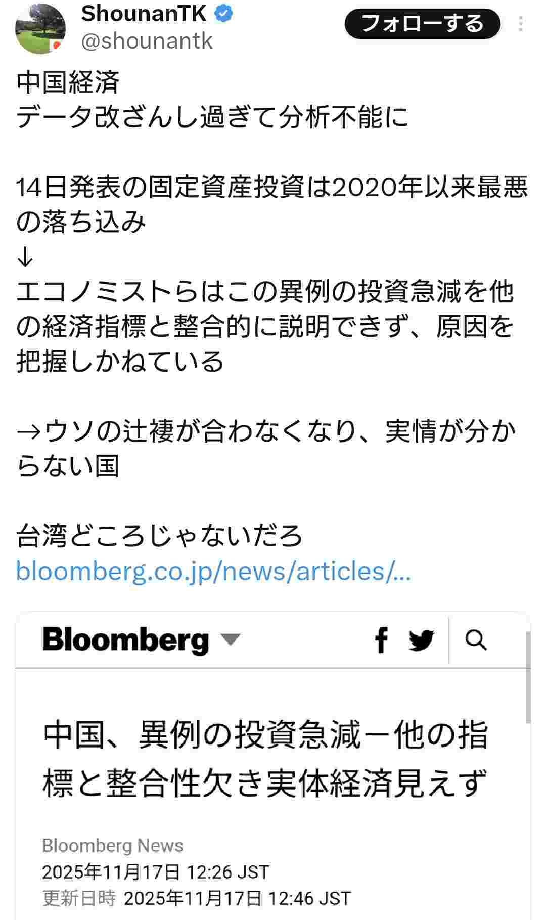 (ブルームバーグ):中国の投資が急激に落ち込んでいる。