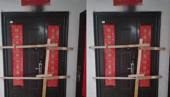 中国に住む韓国人のアパートの玄関を中国人が木と釘で打ち付けて玄関から出られなくしている。