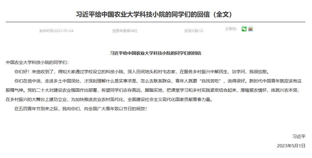 新華社通信によると、中国の指導者である習近平国家主席は大学生に手紙を送り、手紙を公開した。