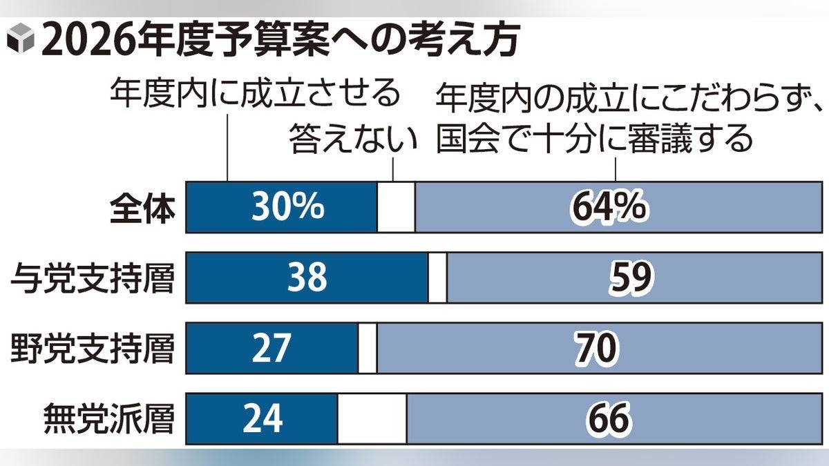 読売新聞社が20~22日に実施した全国世論調査で、2026年度の予算案を、年度内の3月末までに成立させるべきだと思うかを尋ねた。「年度内の成立にこだわらず、国会で十分に審議する」との回答が64%で、「年度内に成立させる」の30%を上回った。
