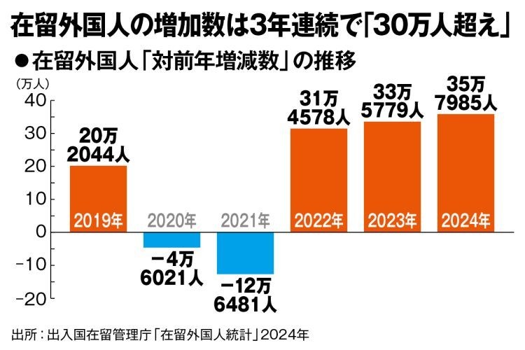 人口減少対策総合研究所の河合雅司理事長の試算によれば、今の「35万人増」ペースが続いたとすると、20年後には「10人1人は外国人」になるという。
