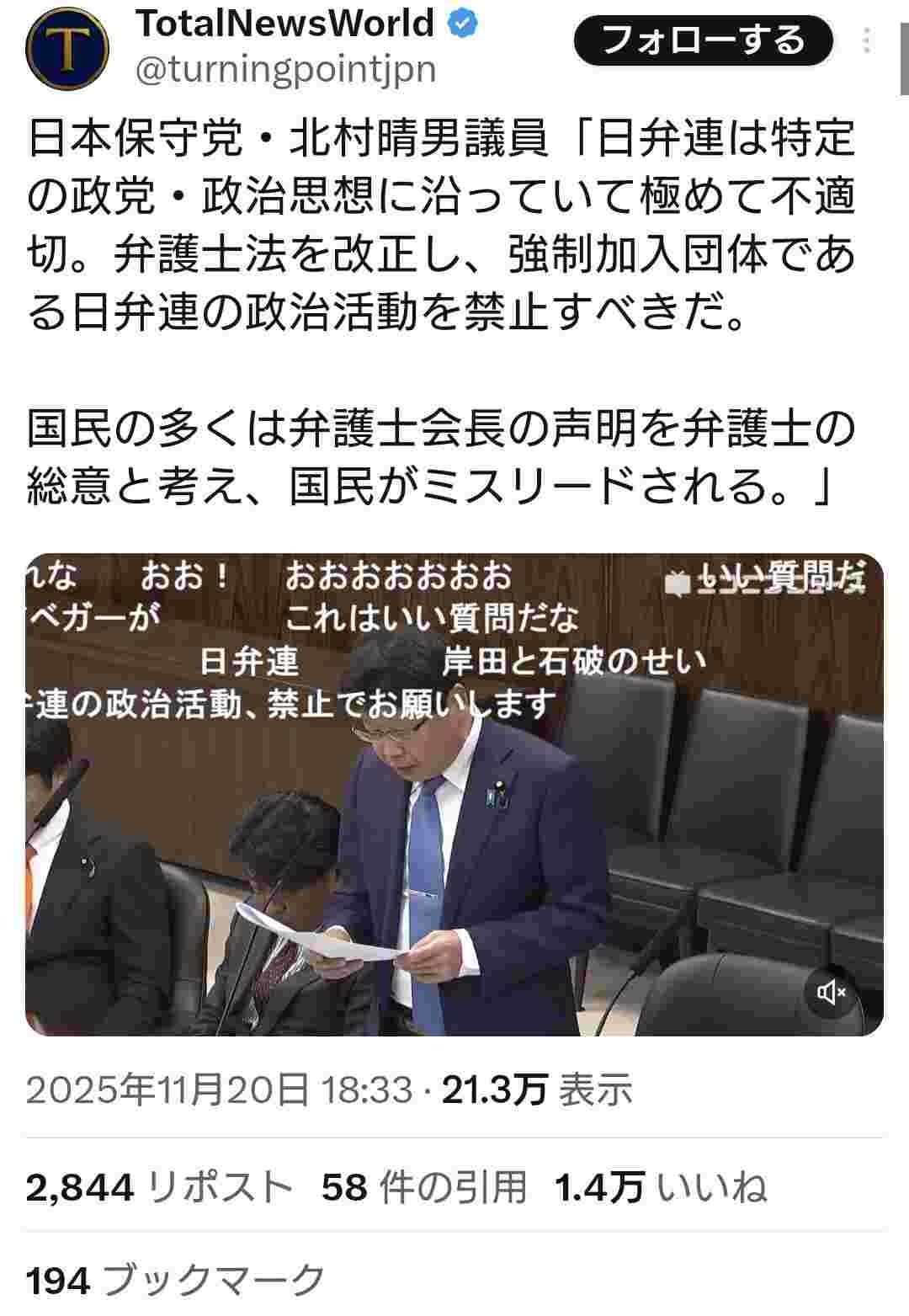 強制加入させた上に会員の意見を聞くわけでもなく勝手に政治発言する日弁連は言論の自由を侵害しとるな