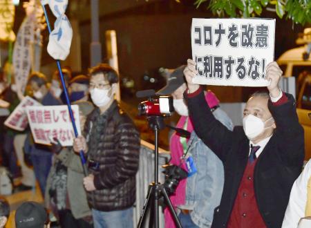 憲法改正に反対し、首相官邸前で抗議する人たち=9日