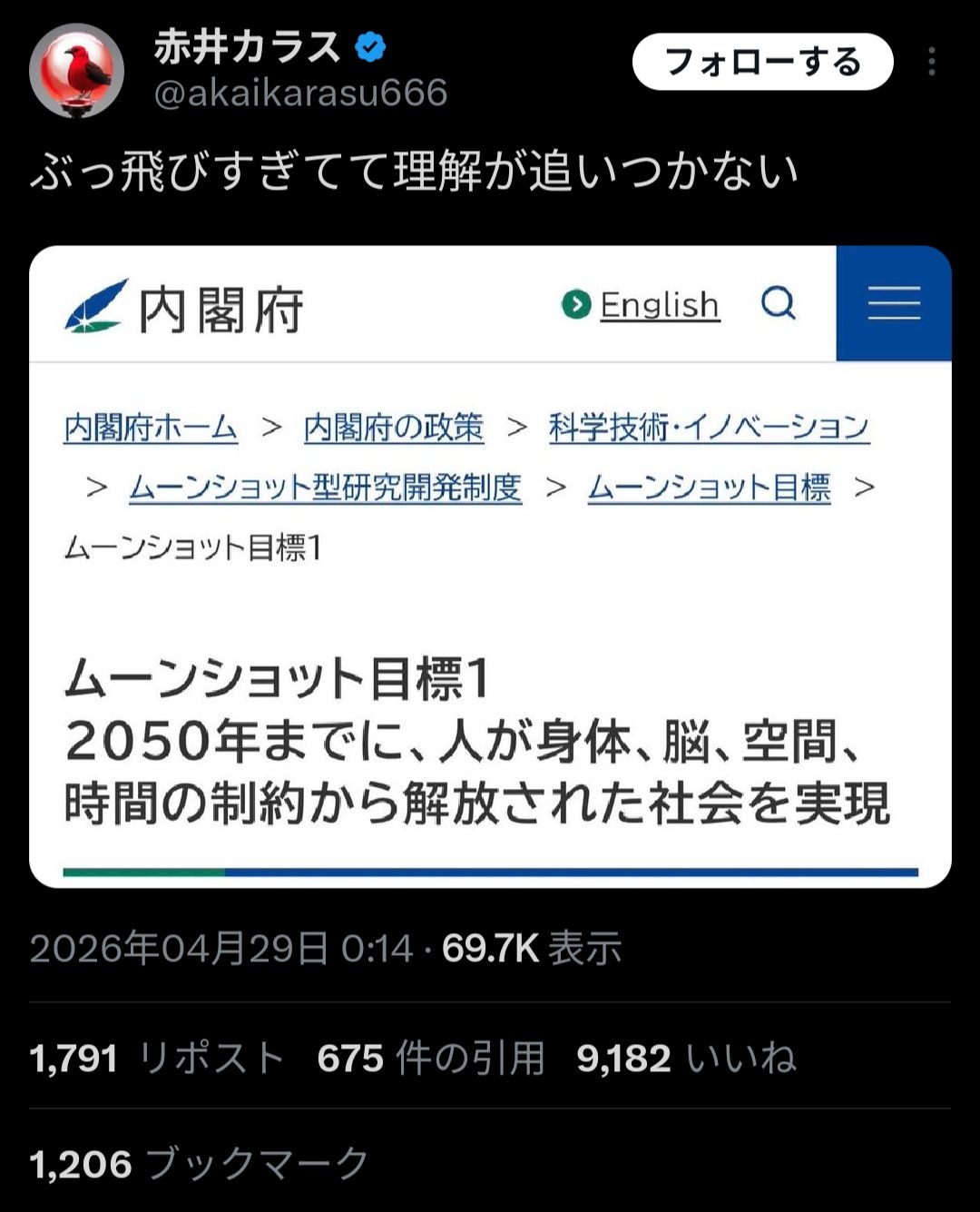 ムーンショット計画って読んでもいまいち何を目標としてるのかわからんのよな