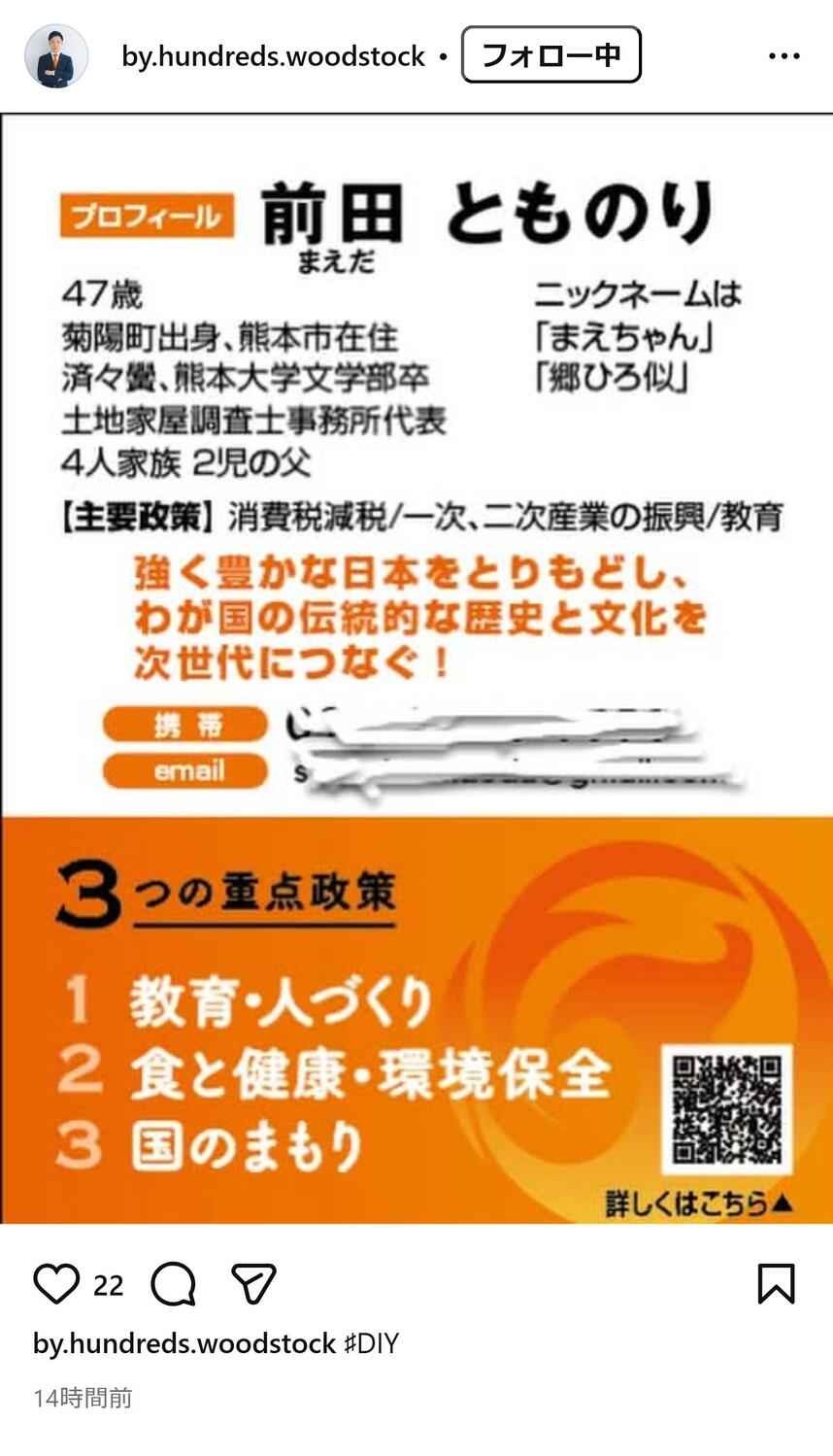 前田氏は先月21日、自身のSNSで自己紹介。「熊本市在住 済々黌、熊本大学文学部卒、ニックネームは『まえちゃん』、