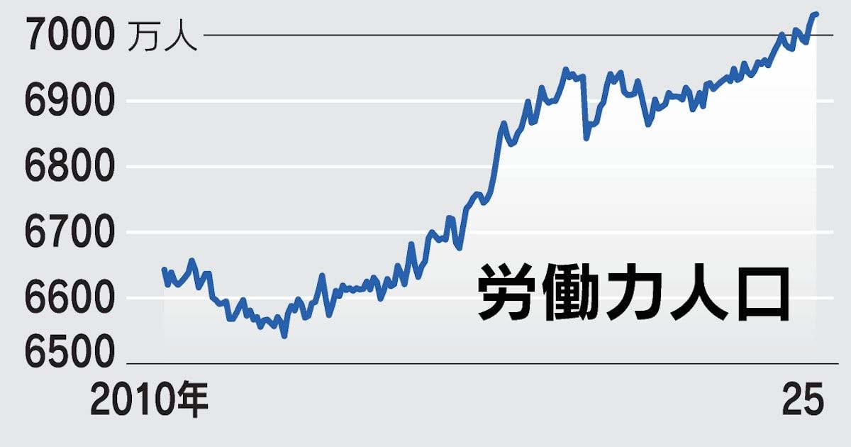 労働市場に参加する人が年平均で初めて7000万人を超えそうな勢いだ。女性や高齢者の労働参加が続いており、人口減少下でも働き手が増え続けている。パートなど短い時間で働く人が伸びる。社会保険料負担を避けるために働く時間を抑える「年収の壁」の見直しで、労働供給はさらに延ばす余地が出てくる。