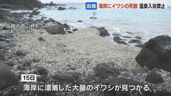 北海道函館市恵山岬町の海岸に大量のイワシが漂着した影響で、海岸沿いの温泉が入浴禁止になっています。