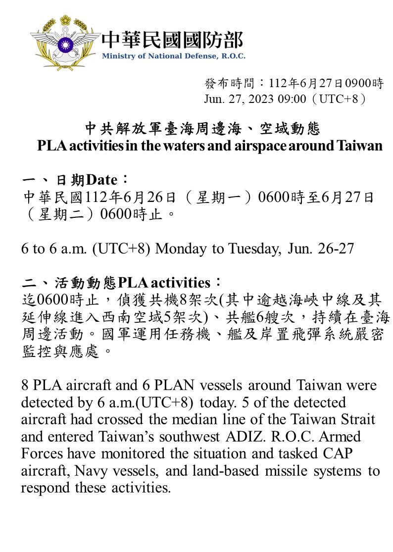 https://twitter.com/MoNDefense/status/1673498517451739137台湾軍は中国に武力侵攻の口実を与えないために先制攻撃はしないと常々言ってきたが、台湾国防相は3月、それは台湾軍が領空を守らないという意味ではないと公言していた。