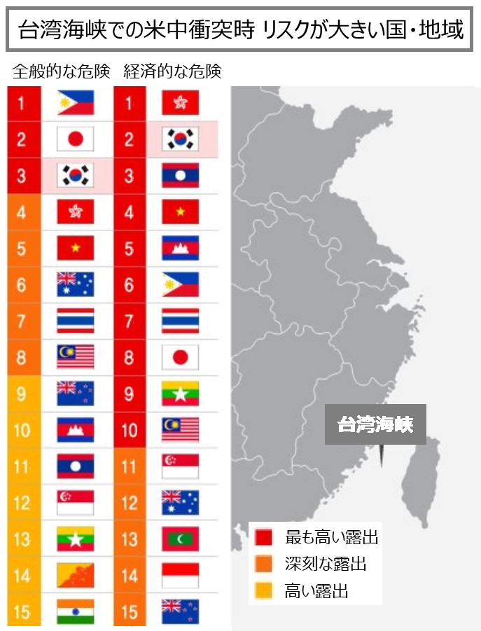 EIUは、フィリピンと日本、韓国が地政学的に台湾海峡に近く、中国との貿易依存度が高いうえ、米国の同盟国としての役割が台湾紛争時の高い危険要因だと明らかにした。特に、米軍が駐留している点から、中国の先制攻撃にこれら3カ国が脆弱である点も理由として挙げた。