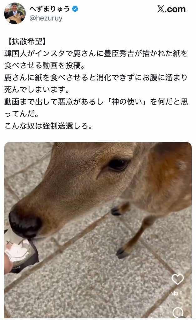 豊臣秀吉が描かれた紙を食べさせる動画を投稿。鹿さんに紙を食べさせると消化できずに