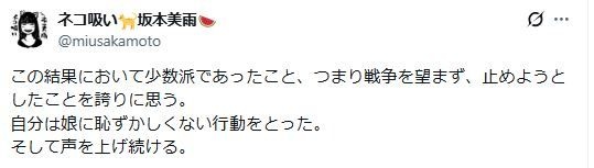 衆院選の結果が出た8日夜には「この結果において少数派であったこと、つまり戦争を望まず、止めようとしたことを誇りに思う。自分は娘に恥ずかしくない行動をとった。そして声を上げ続ける」と思いをつづり、翌朝の投稿では「民主主義が終わっていくなか どう娘たちを守っていくか」と案じた。