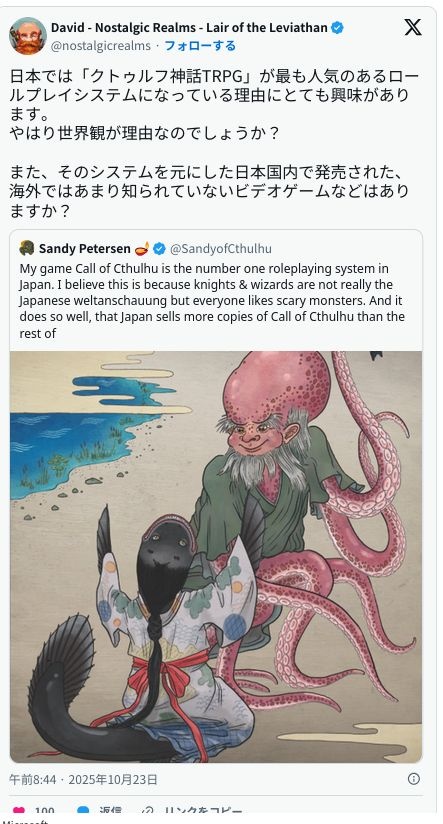 https://news.yahoo.co.jp/articles/5a10e221a7033814b7393d572eac33b28c119f662025年10月23日、『Lair of the Leviathan』を制作している海外ゲーム制作グループNostalgic RealmsのDavid氏は、「日本では『クトゥルフ神話TRPG』が最も人気のあるロールプレイシステムになっている理由にとても興味があります。 やはり世界観が理由なのでしょうか?」という日本語のポストをX(旧Twitter)にて行いました。