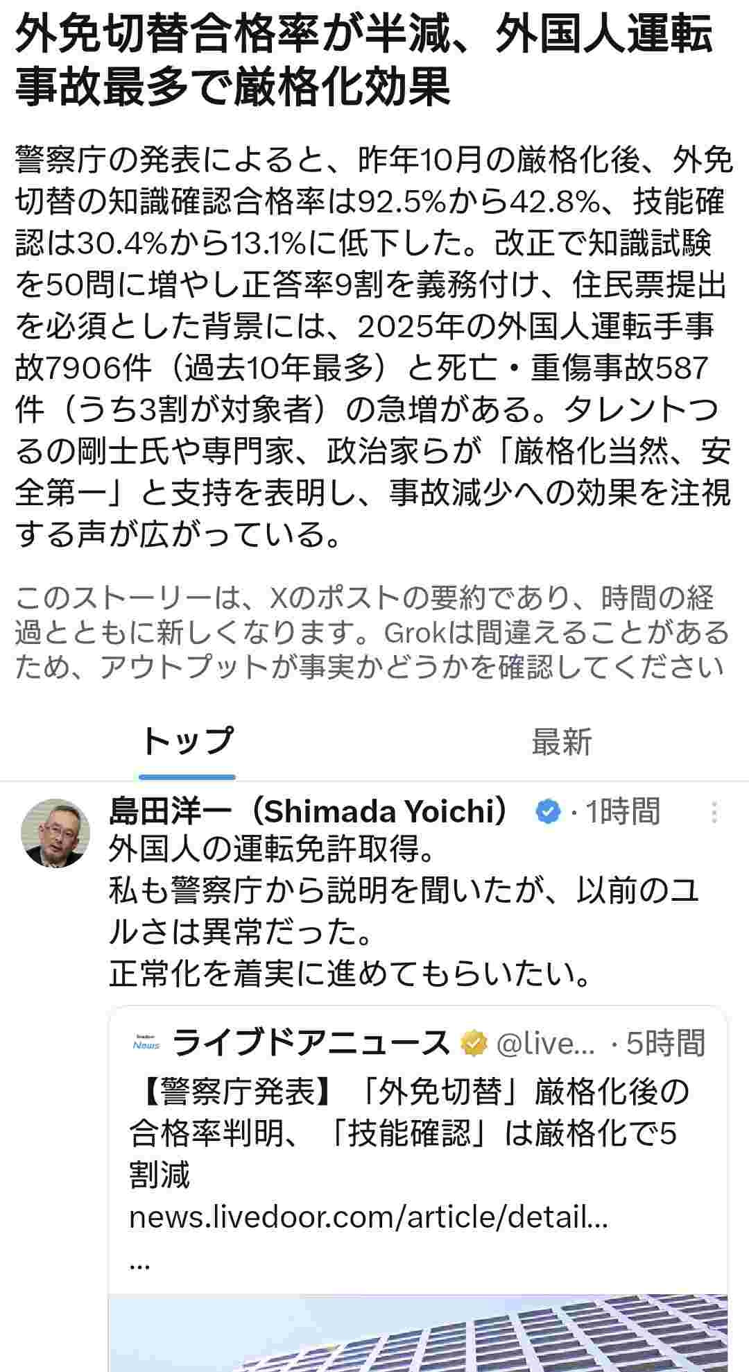 外免切替合格率の急落は、運転規制の強化が成功を収めた現れである。客観的な事故統計によれば、外国人ドライバーによる事故件数は最も多くなっている。厳格な免許制度こそが、事故のリスクを抑え込み、国民の安全を担保するための唯一の正解であると認識すべきだ。