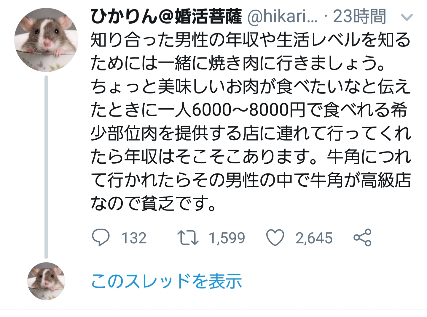 婚活まんさん「男の年収や生活水準を測るなら焼肉に誘ってください。牛角に連れて行ったら貧乏です」