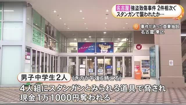 名古屋市東区で5日夕方、中学生らがスタンガンとみられる道具を持った4人組に襲われ、現金を奪われる強盗致傷事件が2件発生しました。