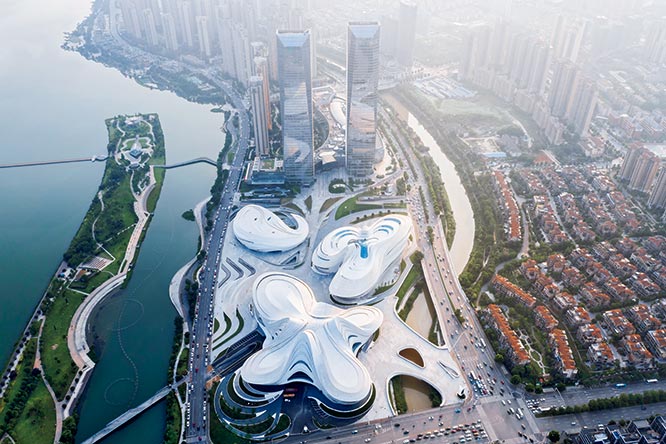 3つの施設は手前が大型劇場、左奥が小劇場、右が現代アート美術館〈MICA〉。新しい地下鉄も建設され、各所と直結する。梅溪湖に浮かぶ島を含め、一帯が文化エリアになっている。