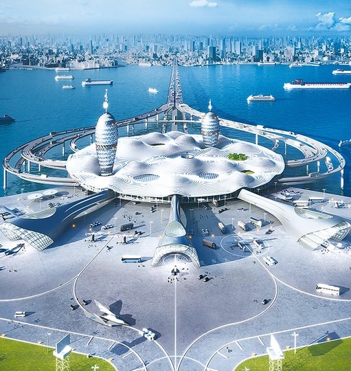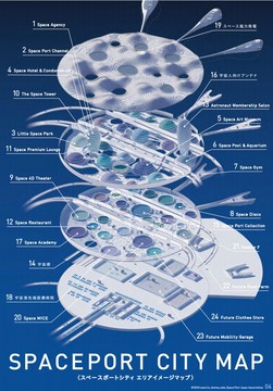 海上に浮かぶ巨大複合施設からは、月や火星への旅行だけでなく、高度100kmまで上昇し、地上の別の地点に移動するサブオービタル旅行の空港として活用されます。また、ここはアジアのハブ空港になるだけでなく、宇宙に関わる映画館やホテル、テーマパーク、放送局、水族館、ディスコ、宇宙食レストランなどのアミューズメント施設も数多く併設され、ユニークなものでは交信用の宇宙人向けアンテナという設備も予定しています。