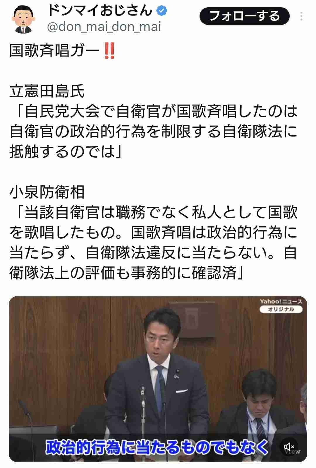 自衛官が国歌歌ってもいいけど 自民党大会はアカン