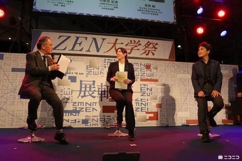 小野田氏はその後、ブースの視察をしながらトークショー会場へ。KADOKAWAの夏野剛社長、「ZEN大学」コンテンツ産業史アーカイブ研究センターの細井浩一所長とともに、コンテンツ産業の現在や未来、課題などについて意見交換した。