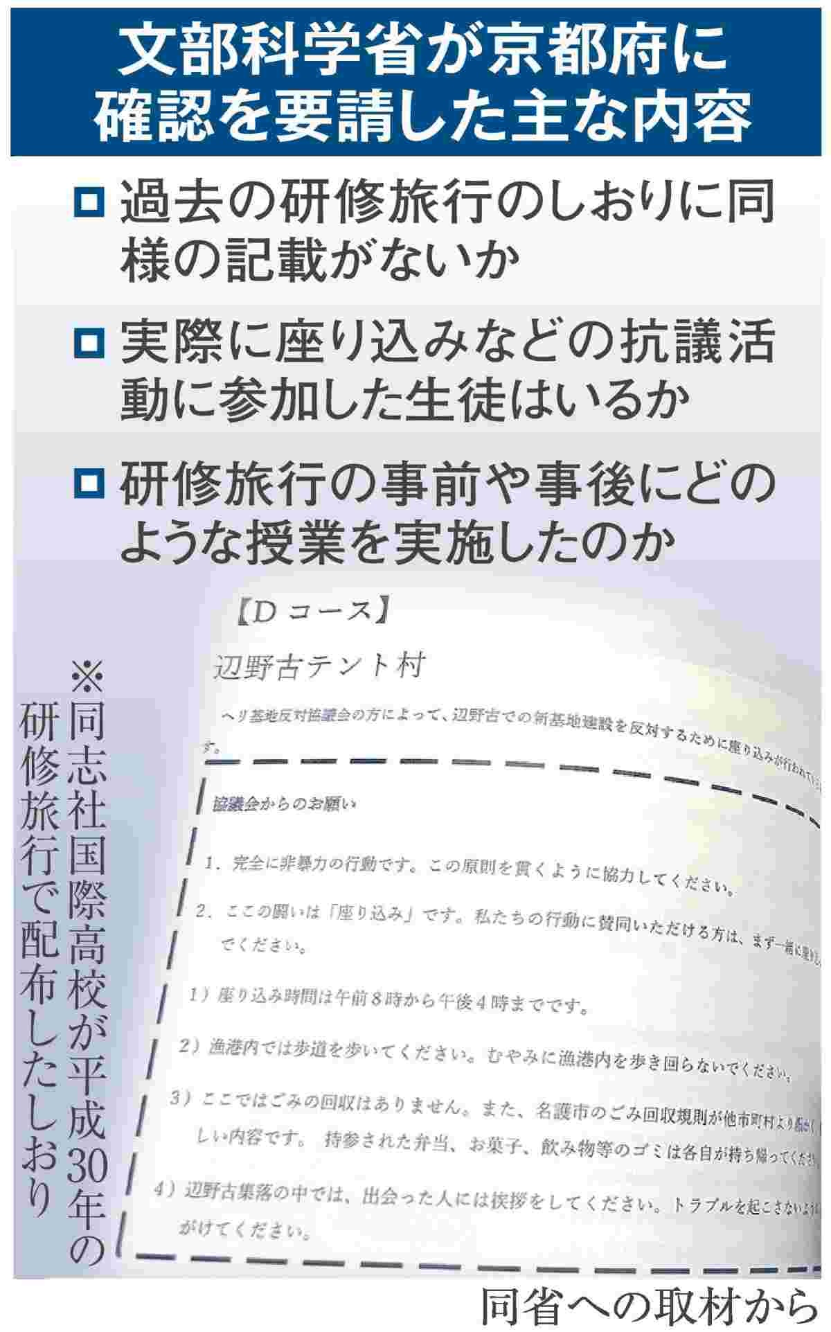 沖縄県名護市辺野古沖の船転覆事故で女子生徒が犠牲となった同志社国際高校(京都府京田辺市)が過去の研修旅行のしおりに、米軍普天間飛行場の辺野古移設に反対する団体による抗議活動への参加を呼びかける文章を掲載していた問題を受け、文部科学省が同校を管轄する京都府に対して調査を要請したことが1日、同省や府への取材で分かった。同省は、実際に生徒が座り込みの抗議活動に参加していないかなどを確認するよう求めており、府は調査を進める。