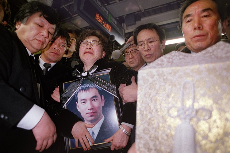 JR新大久保駅の事故現場を訪れた李秀賢さんの父盛大さん(右端)と母辛閠賛さん=2001年1月29日、朝日新聞社撮影――日本には「何度謝っても、韓国は約束を破る」という声もあります。