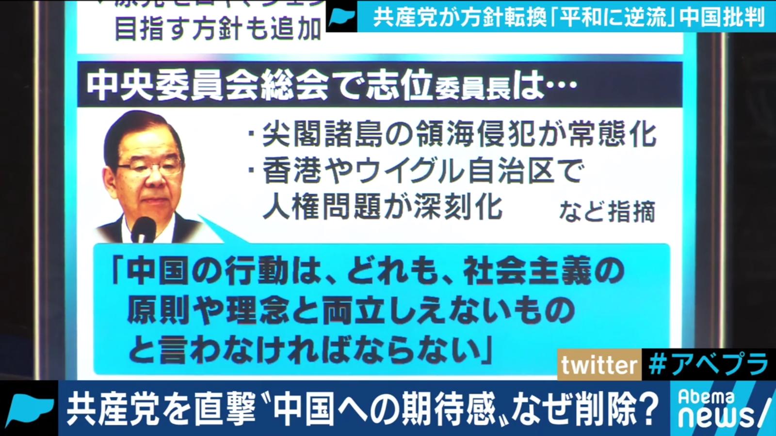 社会主義がめざす新しい探求が開始され、人口が13億を超える大きな地域での発展として、21世紀の世界史の重要な流れの一つとなろうとしている」(第3章「世界情勢論」、2004年改定)という記述を削除した。5日放送のAbemaTV『AbemaPrime』に出演した小池晃書記局長は「世界の見方を、もうちょっと長い目で見て正確にしようという思いで綱領を変える。要するに、これは中国が目指しているものは、もはや社会主義とは言えないのではないか、ということだ」と説明する。
