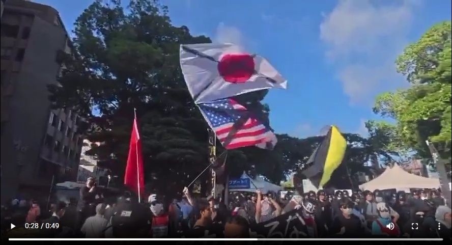 日本国旗とアメリカ国旗にバツ印をつけて反政府デモを行う集団が登場!