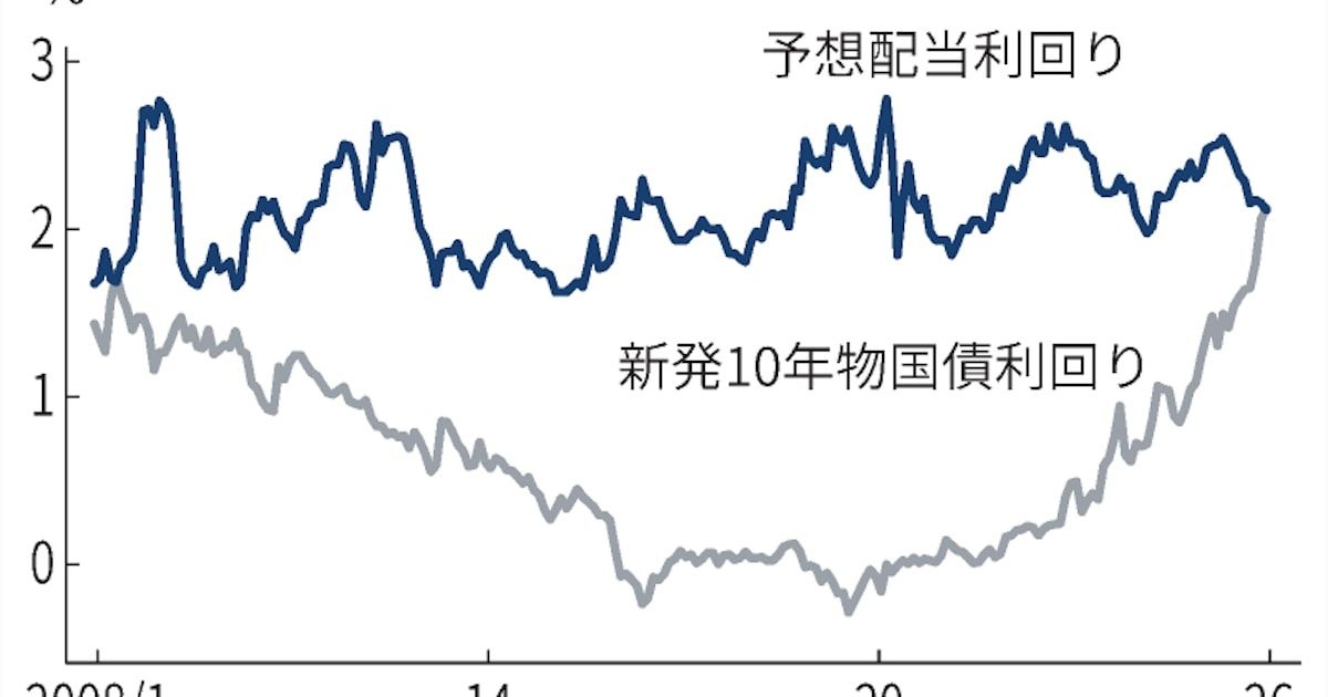 6日の東証プライム市場では上場銘柄の予想配当利回り(加重平均ベース)が2.09%に低下し、長期金利の指標となる新発10年物国債利回り(2.130%)を下回った。株式と債券の利回り逆転は2008年6月以来、約17年半ぶり。株高による配当利回りの低下と金利上昇が同時に進み、逆転が生じた。